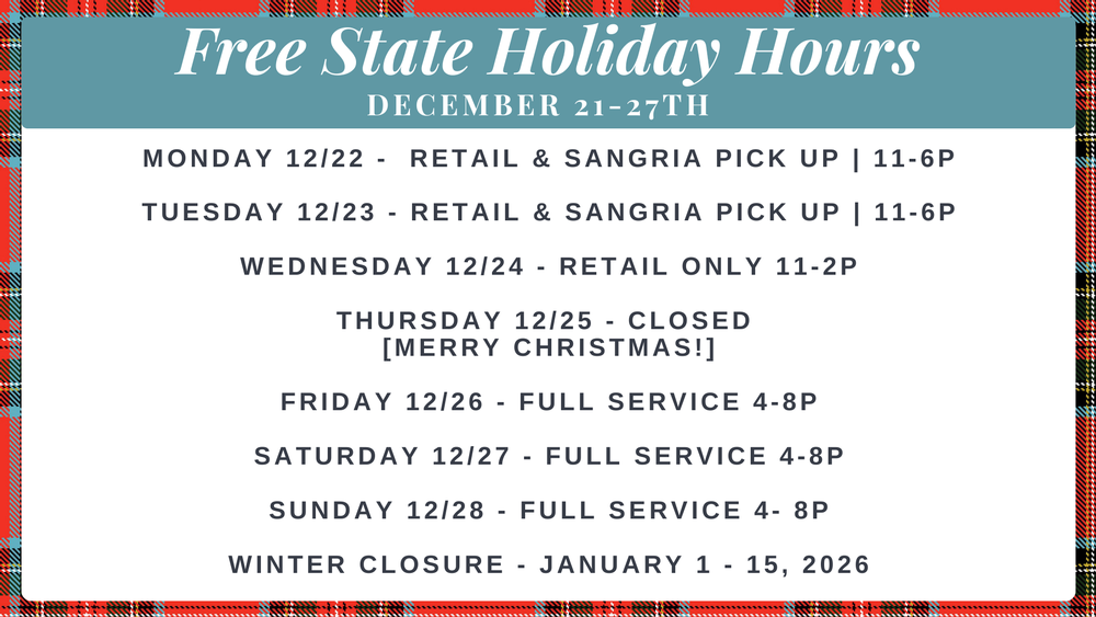 We’ll be open for extra retal hours: Monday & Tuesday: 11a - 6pm for wine sales and gallon pick-ups, and Wednesday (Christmas Eve) from 11–2pm for wine sales.