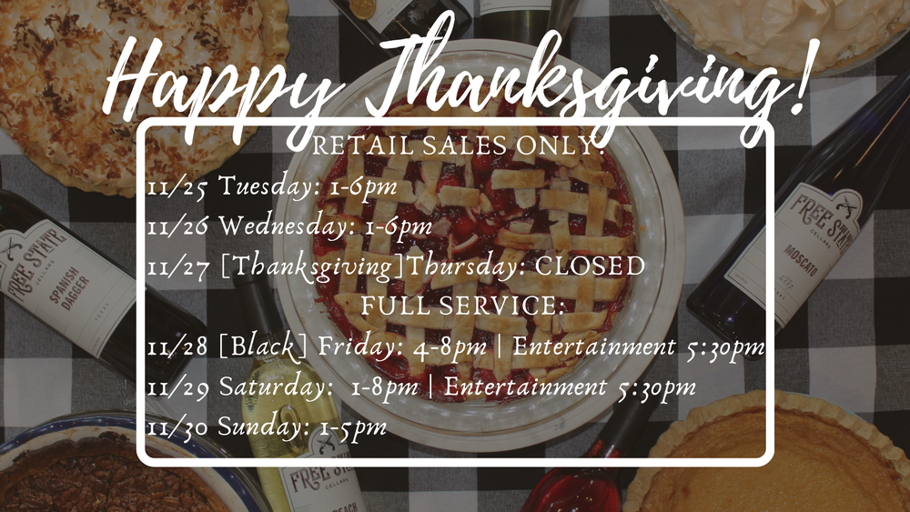 Don’t show up to your holiday celebration empty-handed! Our delicious winter red sangria, served hot, makes for a perfect Christmas cheer. Made with our estate grown 13 Years muscadine wine, apple cider, and mulling spices, you are sure to bring the best gift around. You can preorder online our FULLY PREPARED half-gallon containers for pick-up on Wednesday, November 26, by 6 PM. (No shipping will be available). Unfortunately, we cannot hold for late pickup. Please make sure you are able to get your orders on time. Other Free State Wines are available all week during our extended BLACK FRIDAY retail hours.