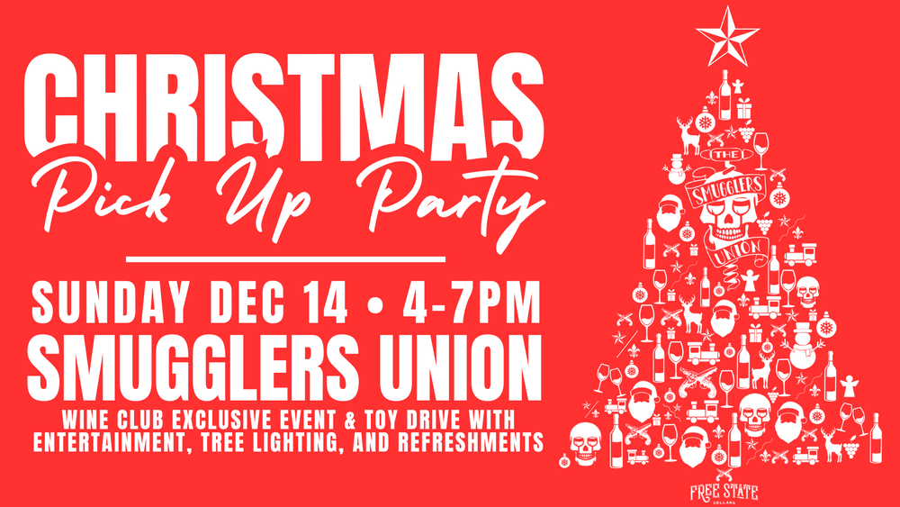 Bring your + one and join us for some Merry and Bright on SUNDAY, DECEMBER 14, 2024 FROM 4 - 7 pm at the SMUGGLERS UNION Q4 WINE CLUB PICKUP AND CHRISTMAS PARTY.