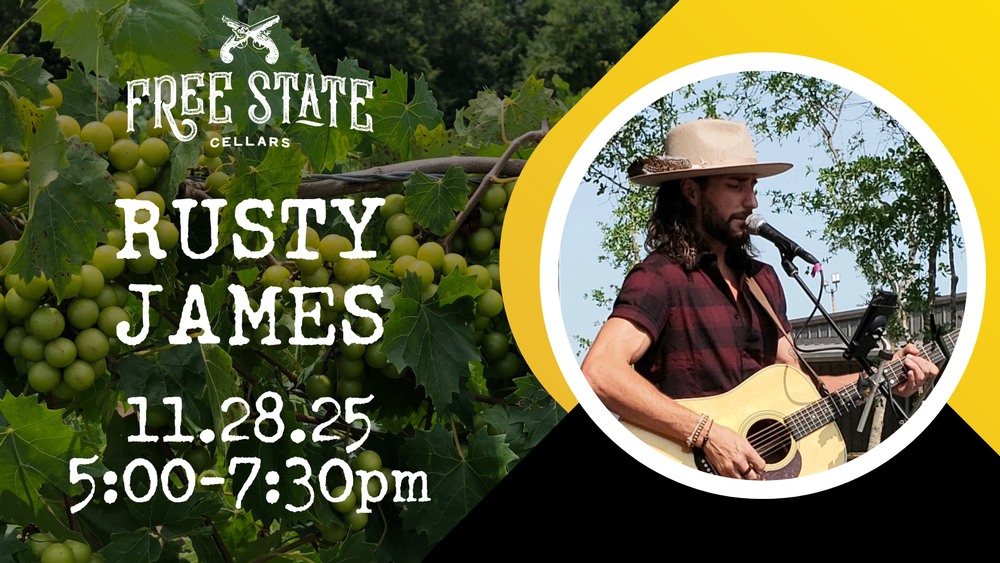 RUSTY JAMES Date: Fri, Nov 28, 2025 Time 5:00 PM to 7:30 PM Venue: Free State Cellars Winery & Vineyard